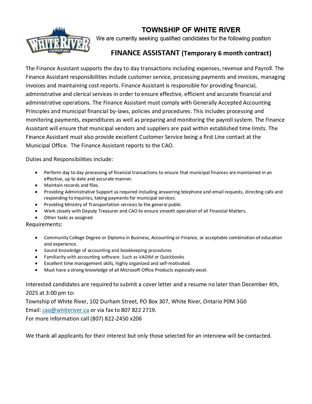If you should have any questions or concerns, please call 807-822-2450 or email wredc@whiteriver.ca